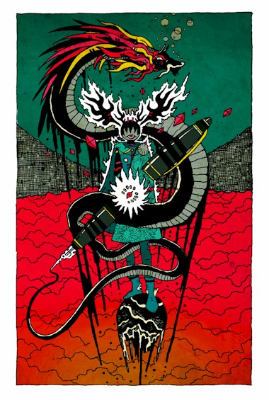 The both are tremendously connected. I met Matt, I joined the band and I started doing posters, all at the same time, on the same night. It was in 2007, and I was in a really pointless, pompous progressive rock band. Matt had put us on at the Actress and Bishop. I had a conversation with him – my guitar was covered with illustrations and stuff... 'I'm kind of thinking about getting into drawing, posters – is this something you'd be interested in?' So he had me do a poster for a band.